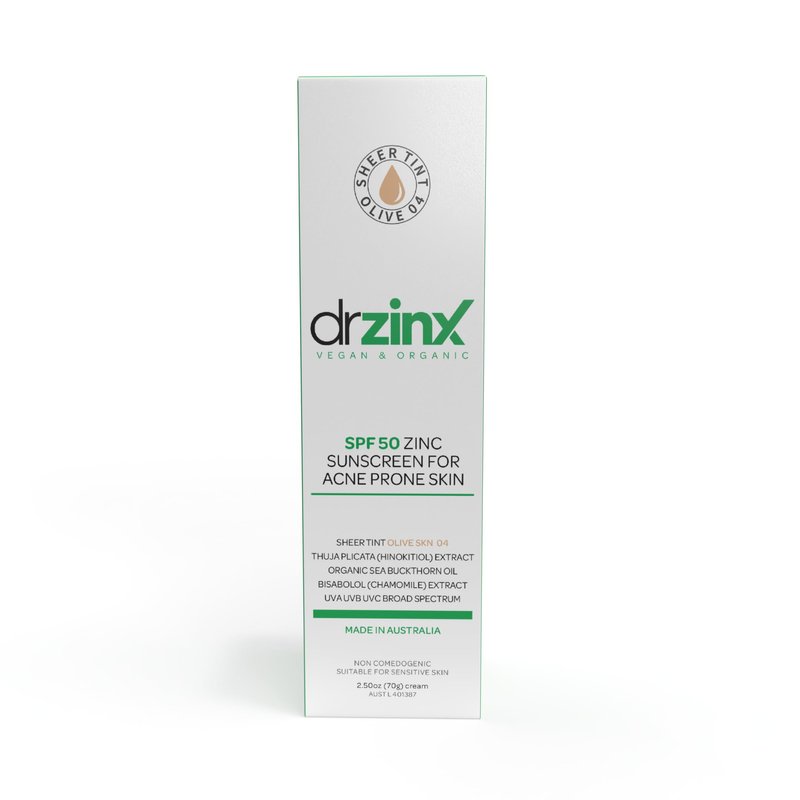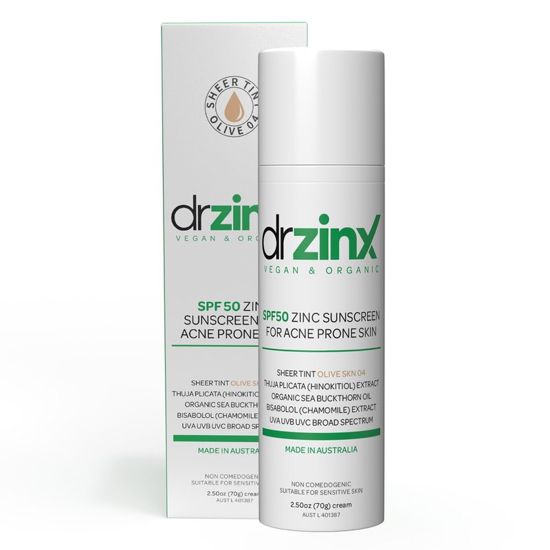 Dr ZinX Organic Mineral Sunscreen for Acne Prone Skin SPF50, OLIVE Tint, Zinc + Hinokitiol (Cedar Oil)