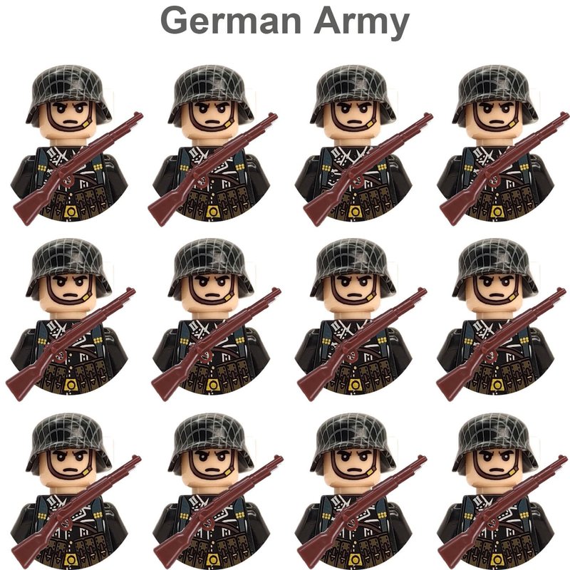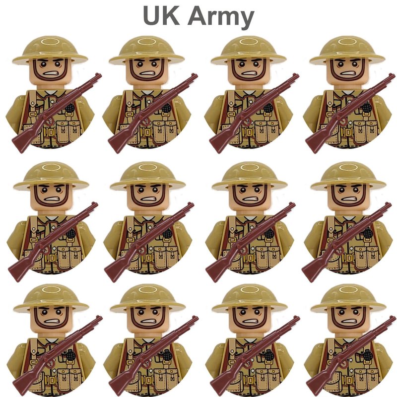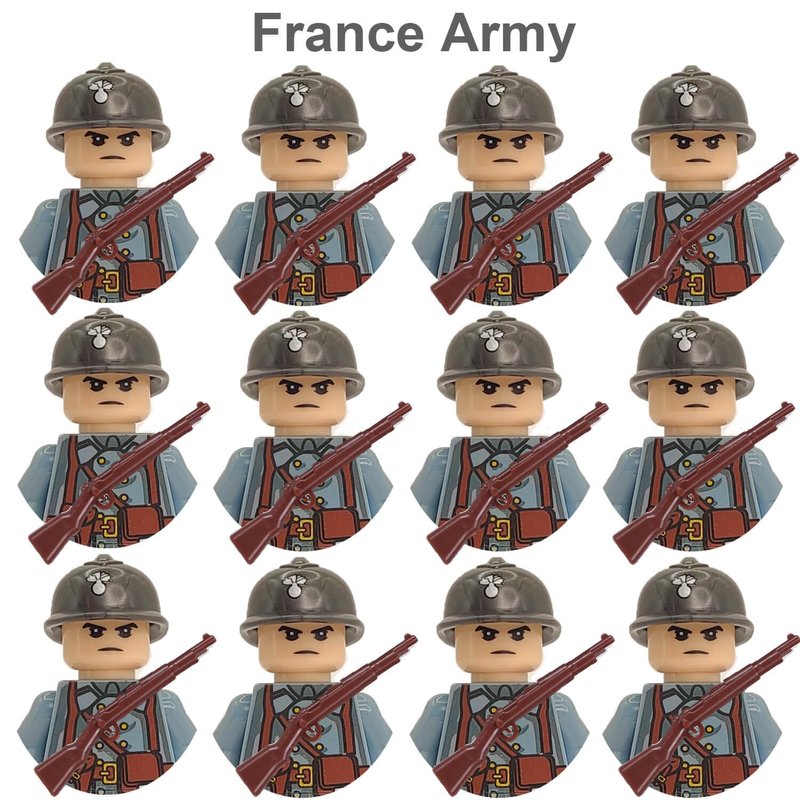 - INCLUDES: TEN (10) WW2 American soldiers, TEN (10) WW2 German soldiers, TEN (10) France soldiers, TEN (10) UK soldiers, 20 sandbags, 40 rifles.