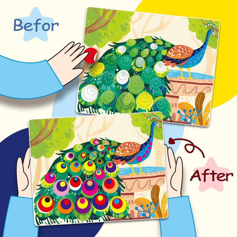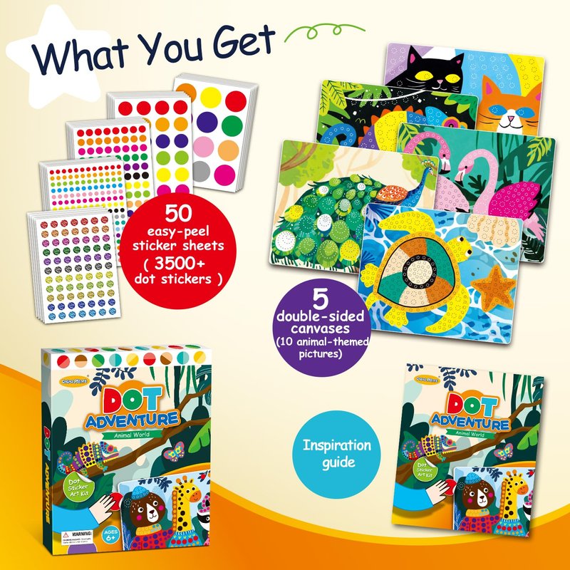 - Peel, Paste, Create: Watch your child's creativity soar as they peel and paste colorful dot stickers onto our canvases, bringing vibrant animal worlds to life!