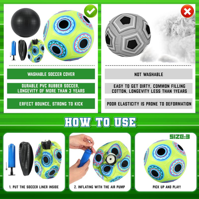 - SOCCER TARGET WITH 3 VELCRO BALLS -This soccer goal is made of soft and lightweight fabric, Velcro balls can easily stick to it and have strong adhesion. The size 3 ball is the perfect size for kids playing and the rubber material ensures long-lasting performance. Put the soccer liner into the ball cover and inflate it with the pump