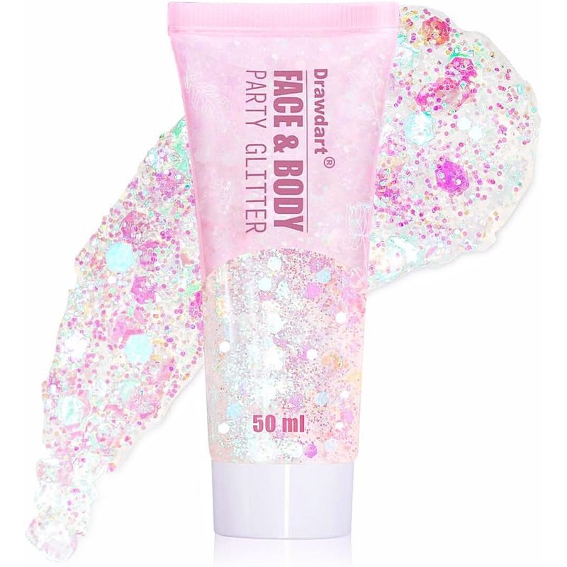 Drawdart Face & Body Glitter, Cosmetic-Grade Glitter Gel- Singer Concerts Disco Festival Rave Accessories, Chunky Hair Sparkling Glitter Gel for Women, Vegan & Cruelty Free- 50ml (White)