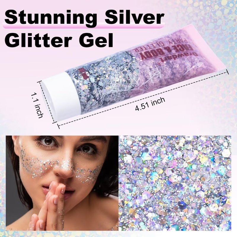 - 【Laser Body Glitter Gel】:Silver body glitter is made of holographic glitter,which is light and durable.The color and luster of the laser sequins vary with the angle of view.This shimmer takes hair and make-up to another level,making your makeup more attractive and eye-catching.