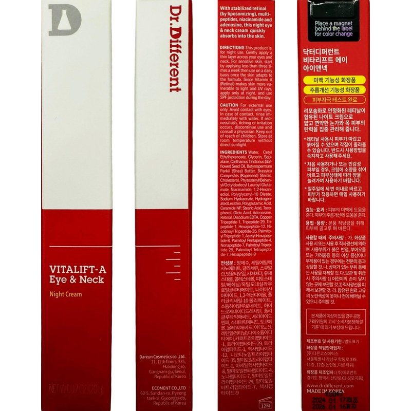 - 【SAFE MULTI-TASKING ANTI-AGING AND DEEPLY MOISTURIZING FORMULA】 Dr.Different VITALIFT-A Eye and Neck anti-wrinkle moisturizing cream is all that you need to diminish your aging signs around the sensitive eye area and neck safely. This multitasking anti-aging cream combines collagen peptides with vitamin-A retinal, so you can use it on your eyes and neck to provide ultimate hydration. You will surely feel smooth, supple, and youthful again.