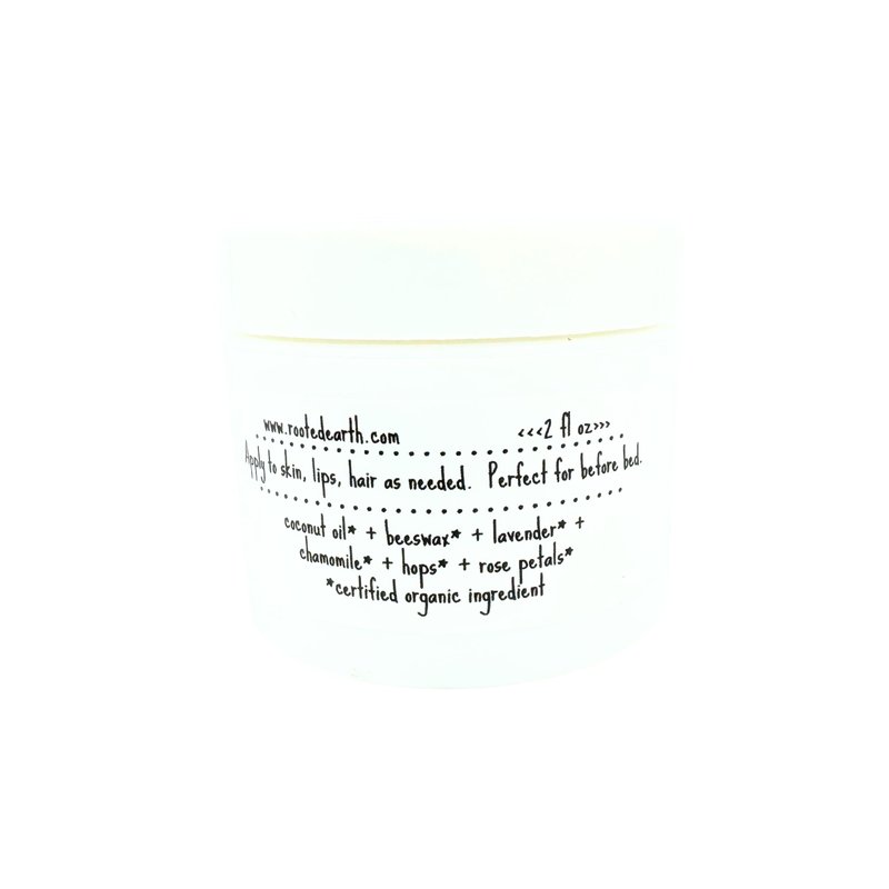 - Made with Organic coconut oil, organic beeswax and infused with organic herbs: lavender + chamomile + hops + rose petals.