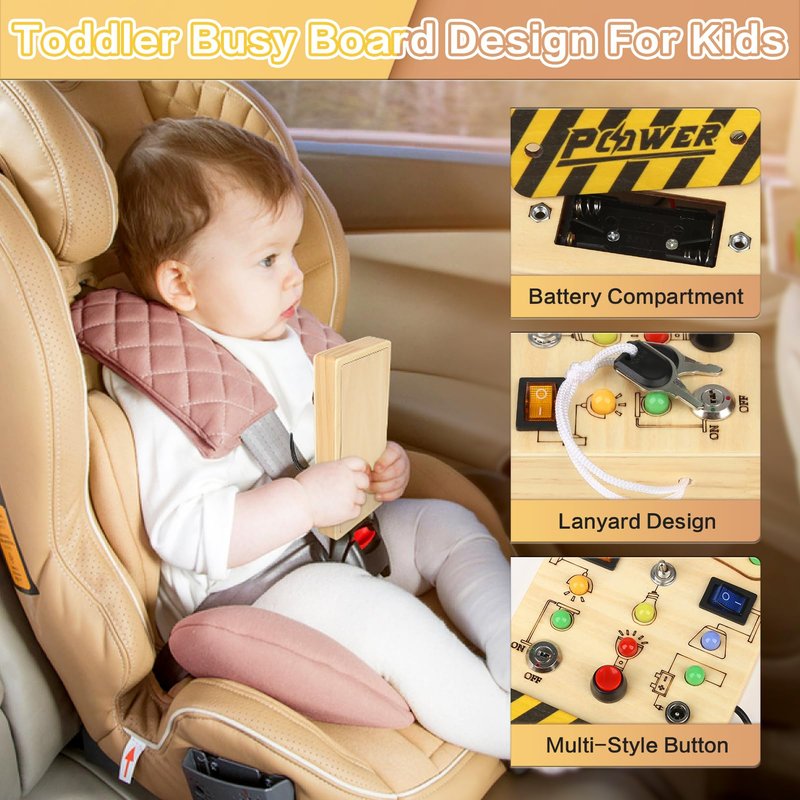 - Montessori Busy Board: This busy board features 7 style switches and 15 LED lights with diverse switches and colorful lights. Rich content brings more fun to young children and will keep them busy for hours! Requires 2 AAA batteries (not included).