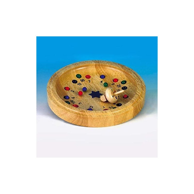 Place 12 colored wooden balls in the center of the wooden roulette playing surface. Spin the wood drediel and knock the balls into the holes on the board. The better and longer the spin, the more points you will score. A game of chance and challenge for dreidel mavens of any age. Non-toxic. Gift box with instructions. Small parts, not for children under the age of 6. Dimensions: 9 inch diameter.