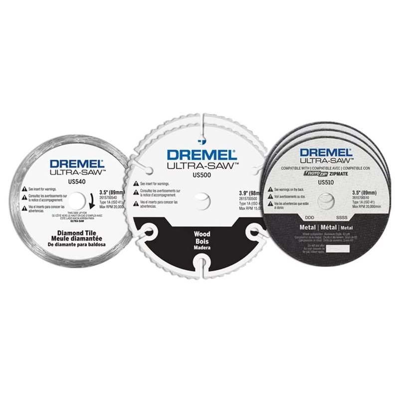 - Kit Includes (1) US540 premium diamond tile cutting wheel, (2) US500 premium carbide Swiss Made wood cutting wheel, (3) US510 metal cutting wheels.