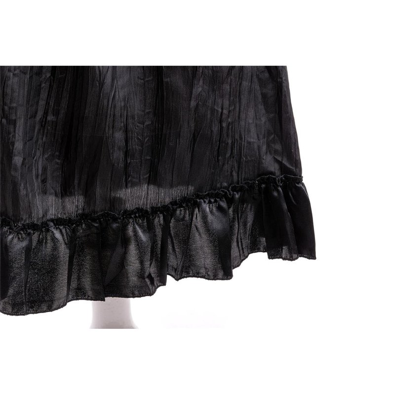 - Black gown, high collar, bell sleeves, ruching details, ruffle skirt hem