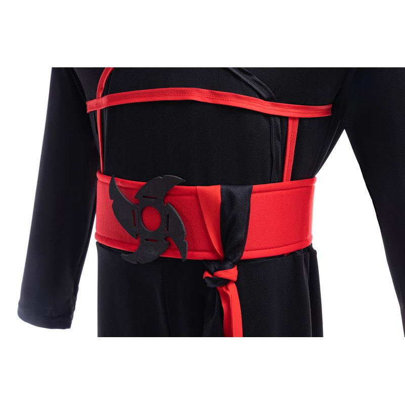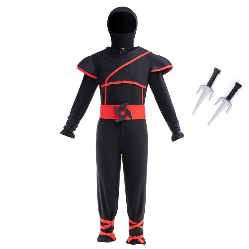 - Black long sleeves jumpsuit and head mask allows your kid hiding in the shadow. A red belt with ninja darts shuriken pattern. Red and black arm ties and leg ties to add dress up details. A pair of plastic ninja dagger sword brings the character to life!