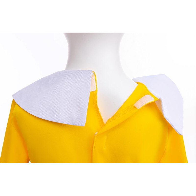 - Short bodysuit, yellow shirt, white collar, blue ribbon bowknot, short sleeves