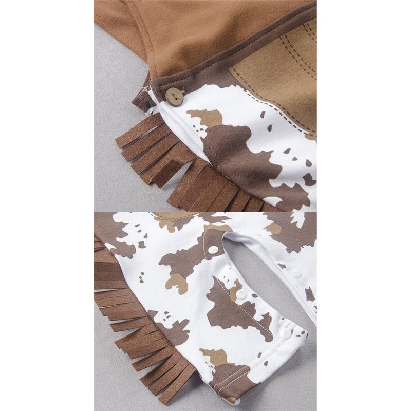 - Cowboy chaps overalls trousers, tank straps, square neckline, cow spots pattern, tassels on legs, snap button at crotch