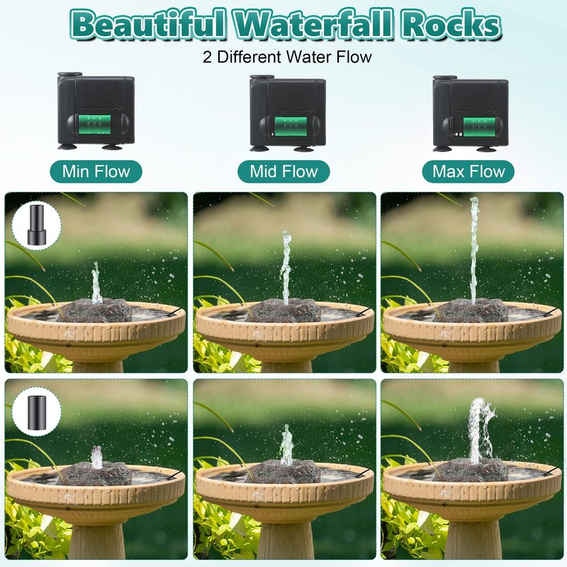 - Powerful Water Pump: max flow rate 500L/H and max lift height 3 feet, effectively adds beneficial bubbles to bird bath water, aids in water circulation, and reduces stagnant water; Please note that to prevent water stagnation, waterfall rocks need at least 1-1/2 inch of water in the birdbath to keep the recirculation working properly
