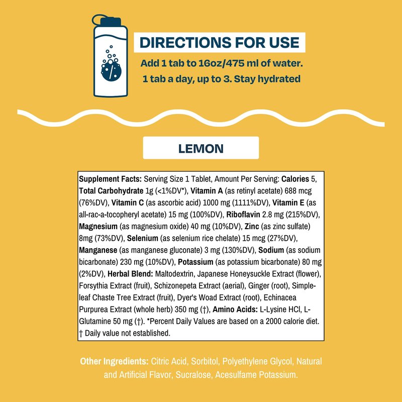 Drinklits LEMON Daily Immunity – your companion for a wellness-packed day with a burst of zesty lemon flavor! These self-dissolving tablets bring hydration and immune support together seamlessly in your 16oz glass or water bottle. Immunity Boost: Experience ultimate wellness with 1000 mg of Vitamin C and an herbal blend that includes Echinacea, Japanese Honeysuckle, and Ginger, working hand in hand to support your immune system and keep you feeling your best. Antioxidant Bliss: High in antioxidants like Vitamins A, C, & E which help your body combat free radicals, all while giving your taste buds a zesty treat. Comprehensive Wellness: With a carefully crafted blend of vitamins, minerals, and herbs, along with electrolytes and amino acids, this tablet ensures your hydration is taken to the next level, making every sip a step towards well-being. With the added benefit of being gluten-free and environmentally conscious, Drinklits LEMON is more than just a drink; it's your daily reminder that wellness can be as simple as a sip. Crafted with care in the U.S.A.