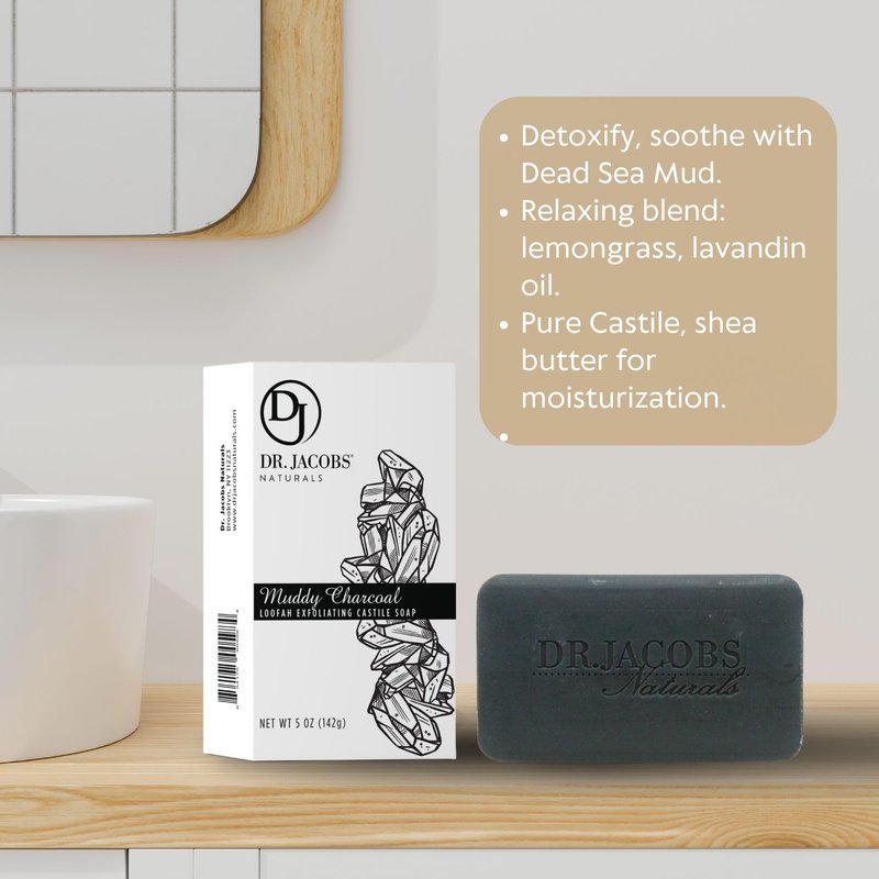 DR.JACOBS NATURALS Castile 5 oz Bar Soap for Face and Body Triple Milled Loofah Exfoliating Vegan (Muddy Charcoal)(4-pack)