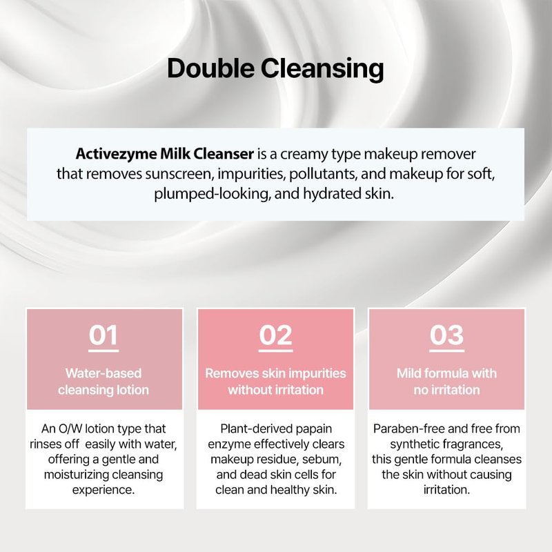 - Great Value - Available at an accessible price point, the Activezyme Milk Cleanser offers exceptional value for its quality and performance. Whether you are a skincare novice or a seasoned enthusiast, this cleanser is a versatile addition to your collection. Experience the difference of a cleanser that not only cleans but also cares for your skin, leaving it refreshed, hydrated, and ready to face the day.