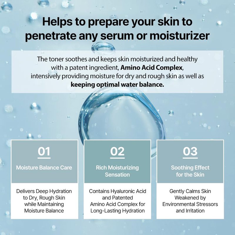 The toner soothes and keeps skin moisturized and healthy with a patent ingredient, Amino Acid Complex, intensively providing moisture for dry and rough skin as well as keeping optimal water balance. It also removes final traces of makeup impurities and balances your skin's pH level, thus prepping your skin to penetrate any serum or moisturizer.