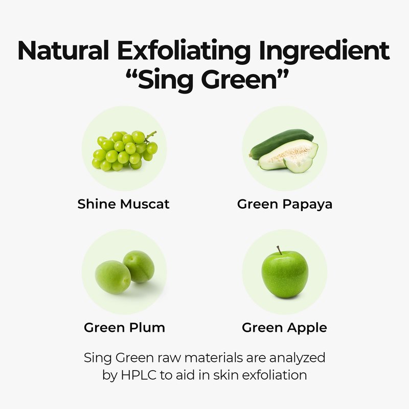 - Contains "Sing Green," a natural exfoliating ingredient with AHA, PHA, and BHA to dissolve remaining dead skin cells and sebum for thorough cleansing.