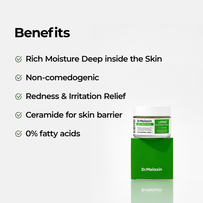 DR.MELAXIN LIPINO Anti-Fatty Acid Noncomedo Cream instantly soothes irritated skin without stickiness, leaving it refreshed and calm with a highly moisturizing texture. Suitable for All Skin Types, Especially Sensitive and Troubled Skin.