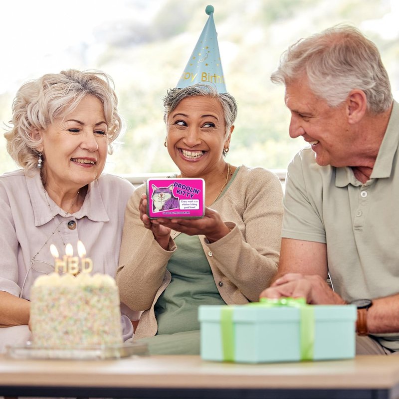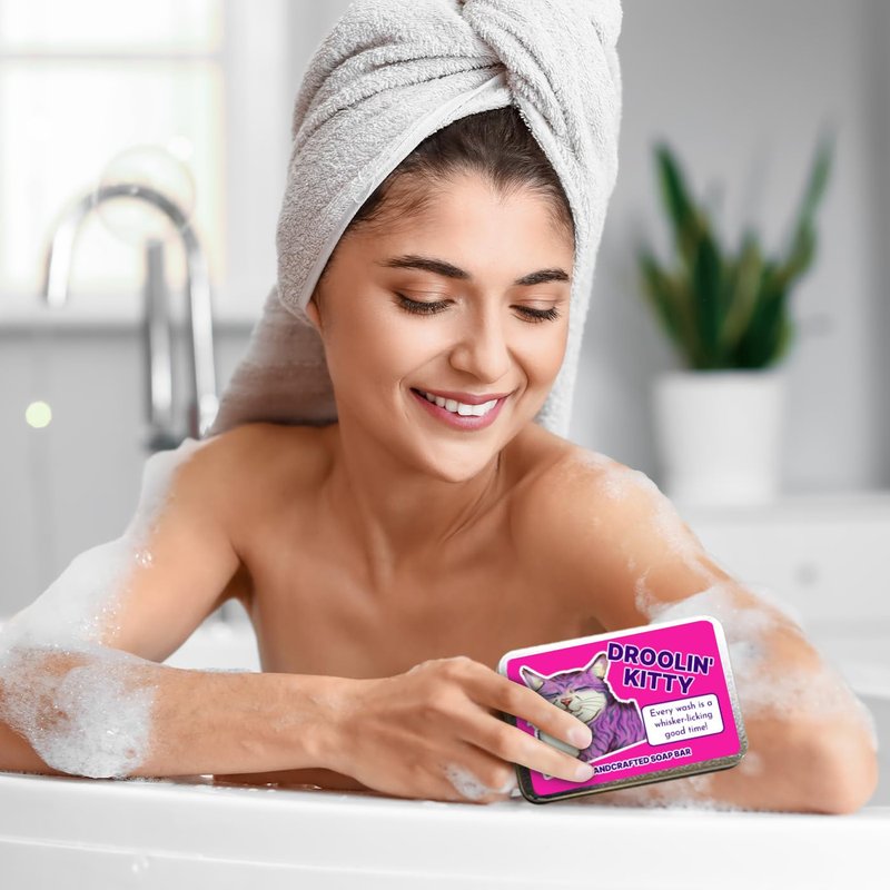 - Quality and Fun Combined: This cool bath gift for women features a hand-poured, fruity pink soap bar inside a metal tin with adorned with a slobbery purple tabby and the playful message, "Droolin' Kitty - Every Wash is a Whisker-Licking Good Time."