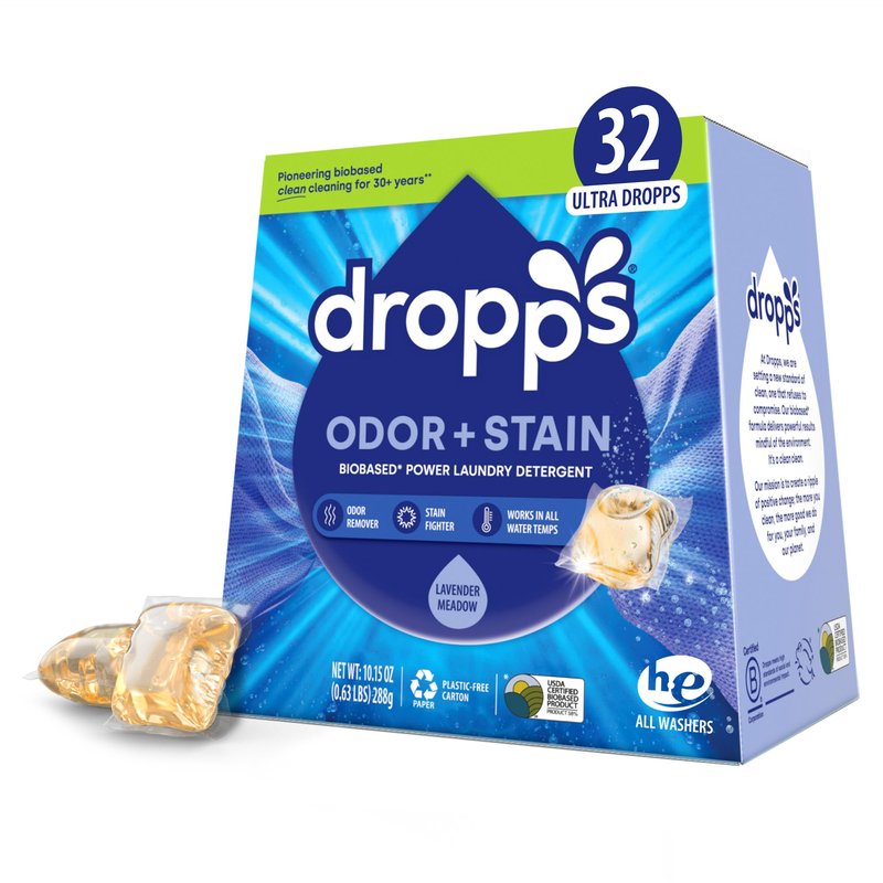 Dropps Stain & Odor Laundry Detergent Pods: Lavender Meadow | 32 Count | HE Compatible + All Washers | Cold Wash + All Temperatures | Tackles Tough Odors | Low Waste Packaging