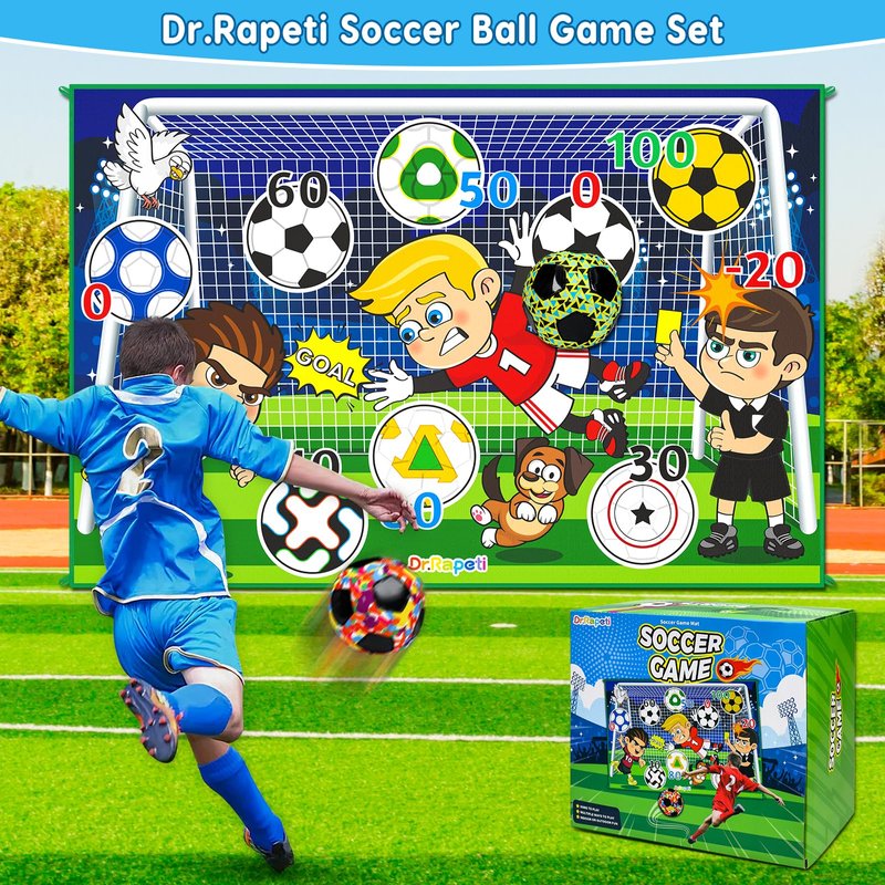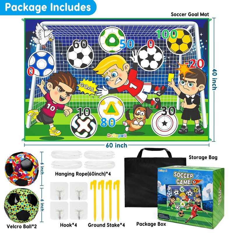 - Soccer Games for Kids: Dr.Rapeti soccer game set contains a 60*40inch soccer goal mat, 2 velcro balls, 4 ground stakes, 4 hooks, 4 hanging ropes, 1 storage bag and a giftable package box. It can create a mini field anywhere