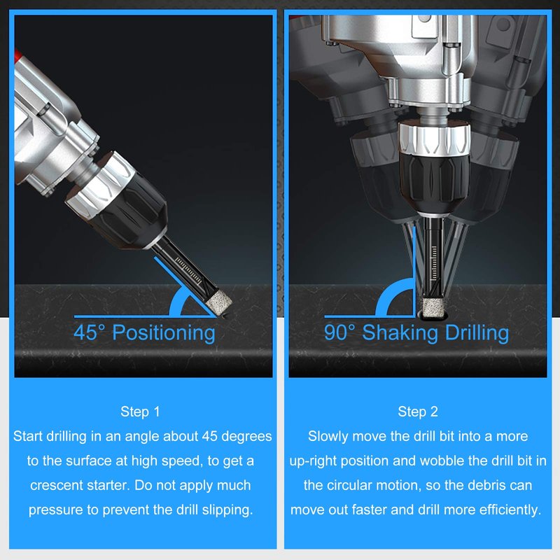 1.Start Drilling the hole in anangle about 45 degrees to the surface, so the drill has the chance to start andwill prevent the drill slipping