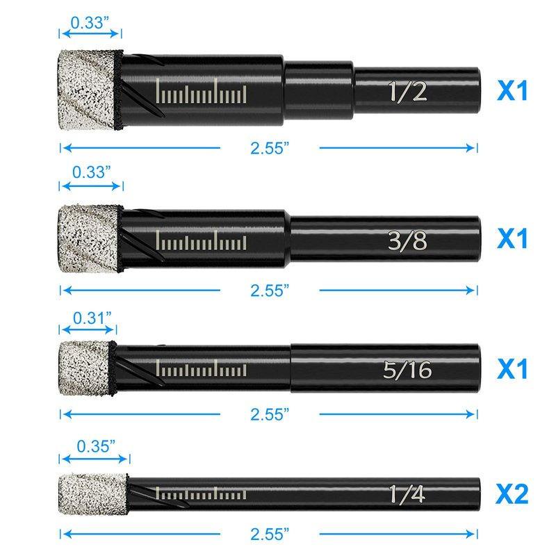 - Add Versatility to Your Tool: 5 Pieces of Dry Diamond Core Drill Bits Kit for drilling holes diameter of 1/4 inch(6mm), 5/16inch (8mm), 3/8inch (10mm) and 1/2inch (12mm);