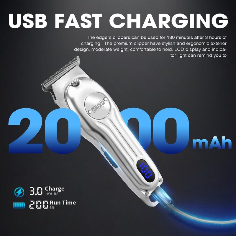 - Ultimate Convenience: Forget the hassle of cords with our men cordless razors for shaving. The DSP barber clippers support plug and play, ensuring you're always ready to trim. With a LED display for easy monitoring and a quick 3-hour charge for prolonged use, grooming has never been more efficient. The Type-C cable, along with essential accessories like oil and brush, makes this professional hair trimmer a must-have in your grooming arsenal.