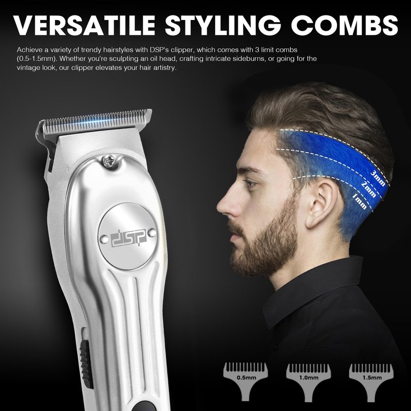 - High-Performance Grooming: Powered by a robust motor (6500RPM) and equipped with a 3CR13 blade, the DSP adjustable beard trimmer ensures a precise cut every time. The metal body, combined with a lithium battery for 70 minutes of discharge time, guarantees durability and uninterrupted grooming sessions. Whether it’s shaping your beard or crafting that perfect hairstyle, our hair cutting machine, a core part of our DSP clippers range, stands ready.