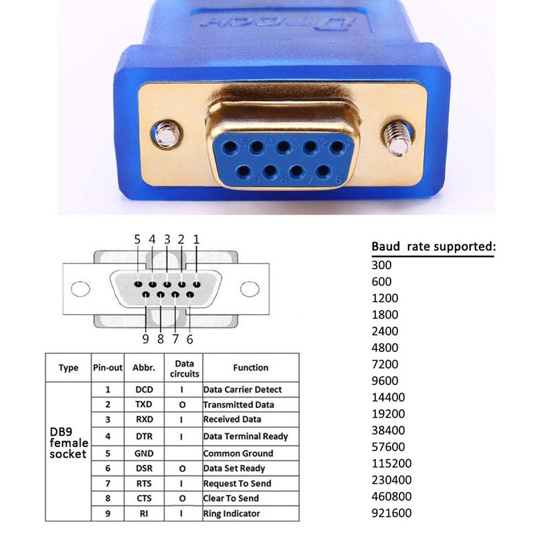 3.Serial to USB 2 converter pingout 1-9: DCD, TXD, RXD, DTR, GND, DSR, RTS, CTS, RI (pin 1-5 row 1 right to left ,pin 6-9 row 2 right to left ). )