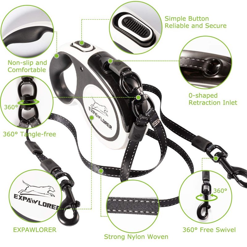 Dual Dog Retractable Leashes 16ft Double-Head Lockable Leash Connect collar harness 360 Swivel No Tangle for Two Dogs Walking Training, Black and White