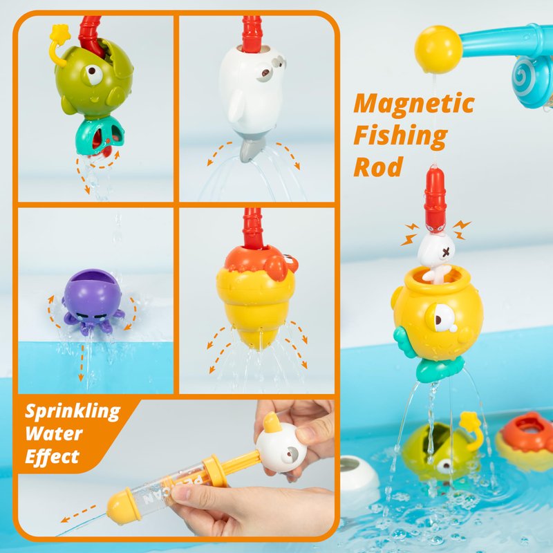 DUCKBOXX XX Fishing Game Bath Toys for Imaginative Interactive Play with Magnetic Rod, Net & Floating Sea Creatures Sprinklers for Kids in Bathtub, Pool & Water Table Mold-Free Anti-Rust (8pcs)