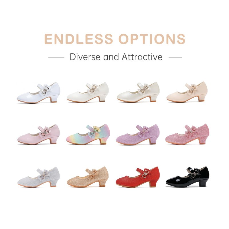 - STURDY AND BEAUTIFUL:The princess shoes are sewn with delicate bows, and there are shimmer on the bows rather than simply glued.Low-heeled shoes make your girls flats more elegantes