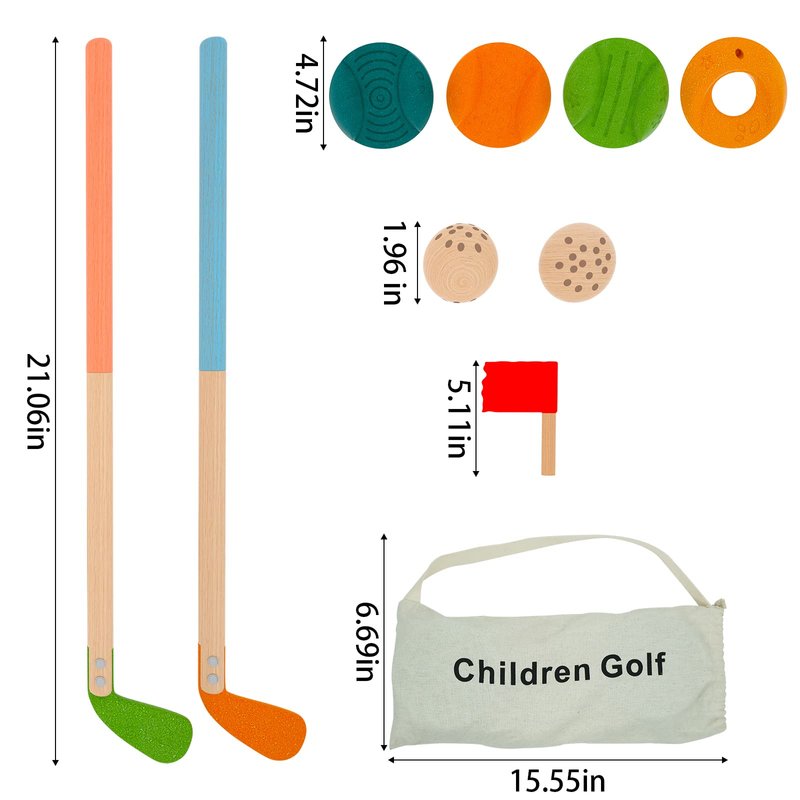 - TODDLER GOLF SET: Our mini golf set includes 2 wooden golf clubs in different colors, 3 different types of challenging courses, 2 wooden balls, 1 golf hole with flag, and a portable handbag for easy carrying and storage.