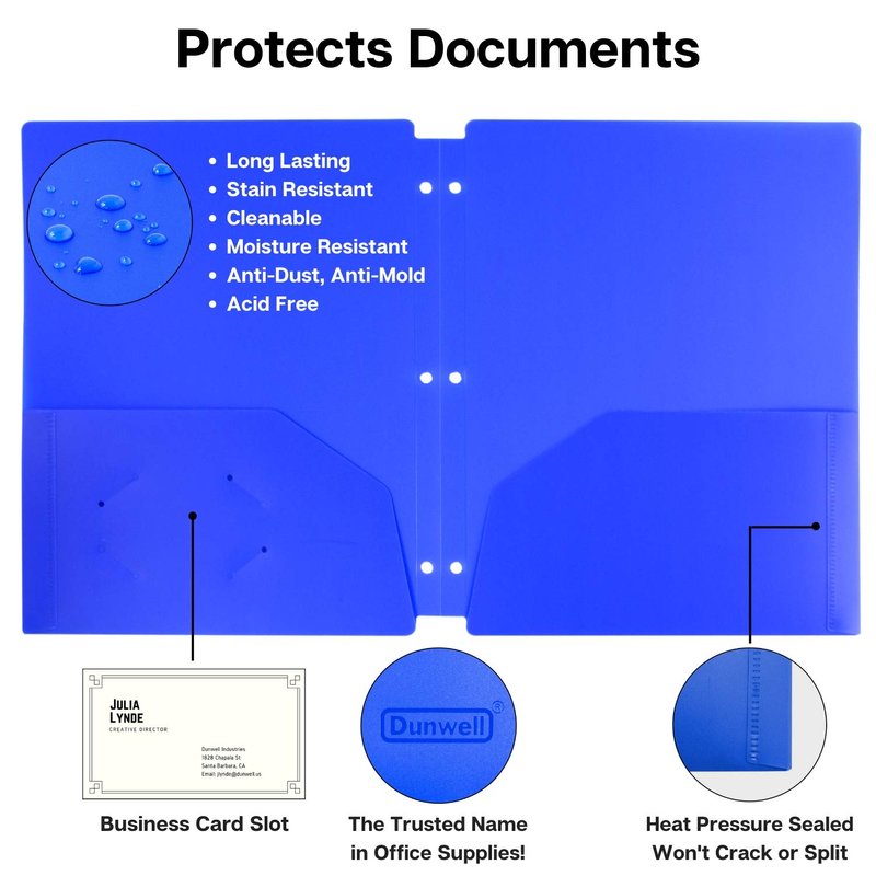 These 3-hole punch folders are durable, cleanable, and water-resistant. Dunwell colored folders with pockets do not tear, wear out, or look ragged. This heavy duty folder for binders are flexible and tear-resistant, lasting much longer than those manila file folders with pockets 3 hole punched. Because these colorful durable folders are constructed of poly plastic, they are easy to clean and water-resistant. They are acid-free to protect your documents for years.