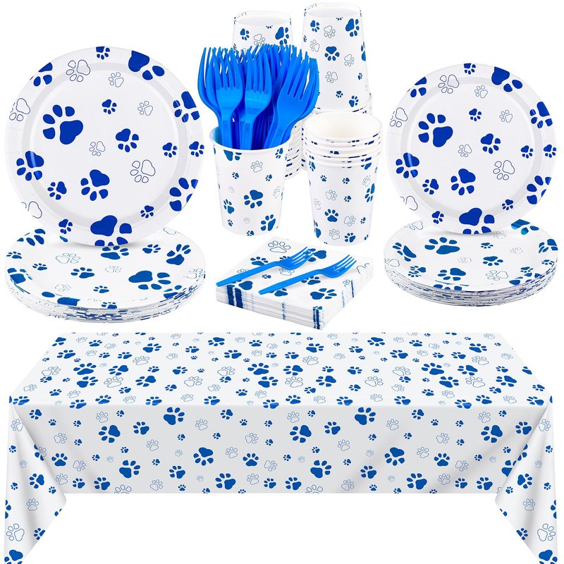- Package includes: you will receive a complete blue-white dog claw party tableware set, including 20 pieces of 7-inch plates, and 20 pieces of 9-inch, 40 pieces of napkins, 20 pieces of 9-ounce paper cups, 20 pieces of forks, and 1 pack of the disposable plastic tablecloth, a total of 121 pieces, sufficient and convenient for your party use