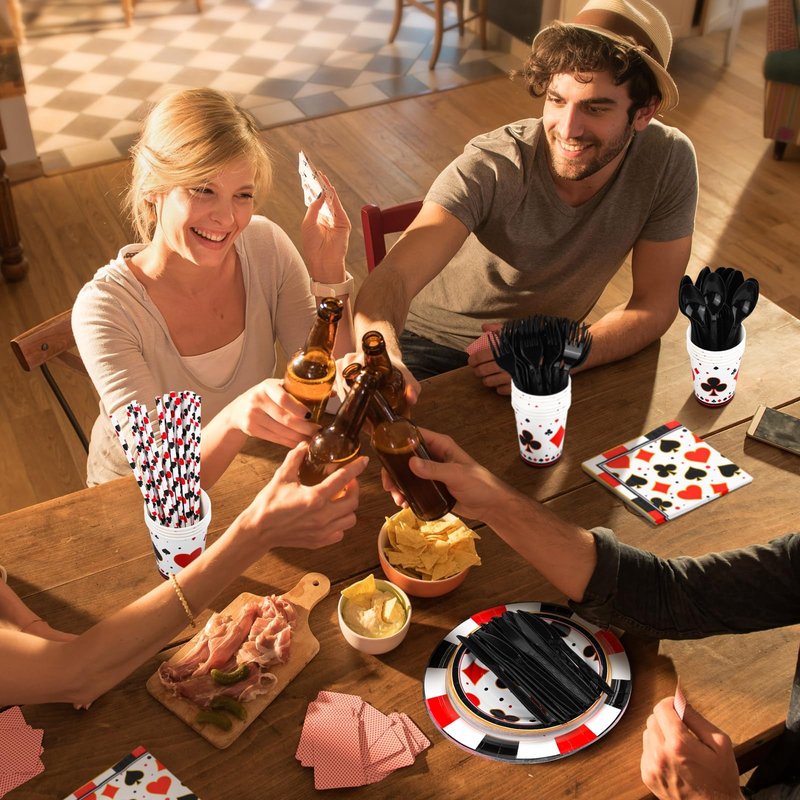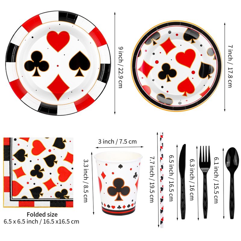 - Package contents: the casino party supplies set contains 16 pieces paper plates of 9-inch, 16 pieces paper plates of 7-inch, 35 pieces paper napkins, 16 pieces paper cups, 16 cutlery sets including forks, knives, spoons, and 16 pieces straws, 147 pieces in total, sufficient to meet your party needs