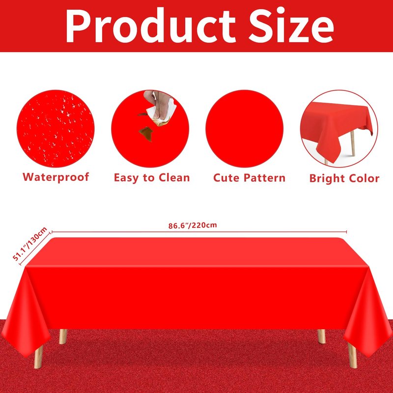 - 🎅Christmas Table Covers: 12 Pack Christmas Tablecloths measured 51 x 86inch (130 x 220cm), perfect for multiple tables and set ups. Christmas red table cover, ideal for Christmas party decoration, Christmas themed party’s table cover. 12 Pieces of Xmas tablecloths are enough to meet your daily usages and replacements, creating a kind of holiday atmosphere, vibrant and convenient.