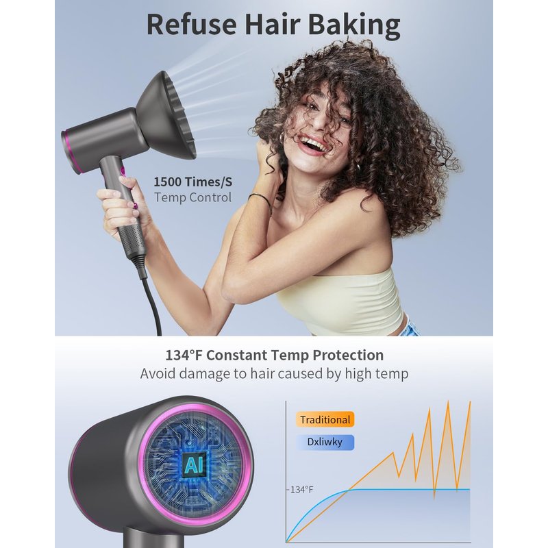 - ✅【1500 times/S Intelligent Temp Control 】The hair blower built-in intelligent temperature control processor, real-time monitoring (1500 times/S) and regulation of high temperature, When the temperature exceeds 134 ℉, it will automatically stop working to avoid overheating damage to your hair .