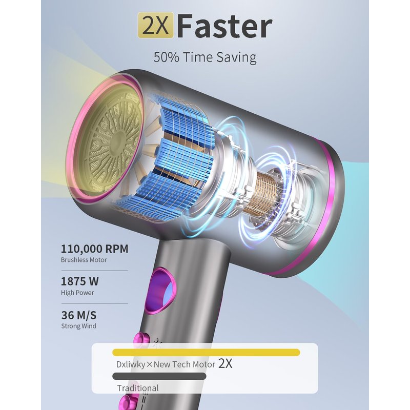 - ✅【1875W Powerful Motor for 2X Faster Drying】The professional hair dryer with 110,000RPM high speed brushless motor provides a strong wind speed up to 36m/s,which can quickly dry your hair in 3 mins.
