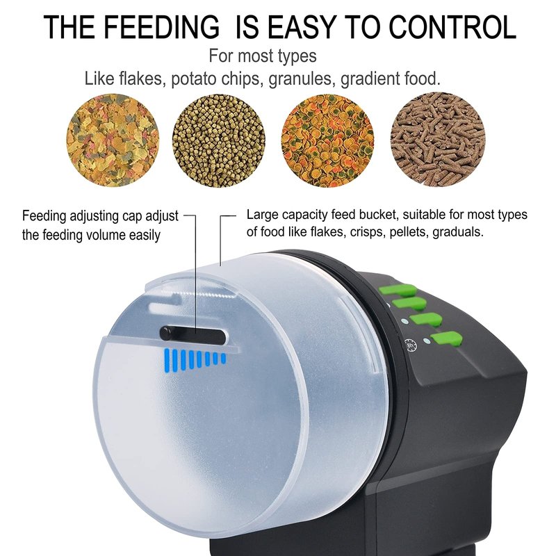 - 【AUTOMATIC FEEDING】Just one button push, the automatic fish feeder allows you to feed every 8hours, 12hours or 24hours automatically or feed any time manually according to your need.
