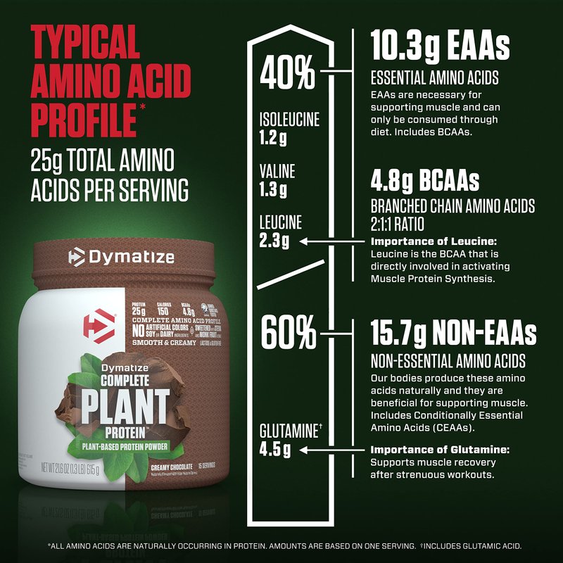 Dymatize Vegan Plant Protein, Creamy Chocolate, 25g Protein, 4.8g BCAAs, Complete Amino Acid Profile, 15 Servings