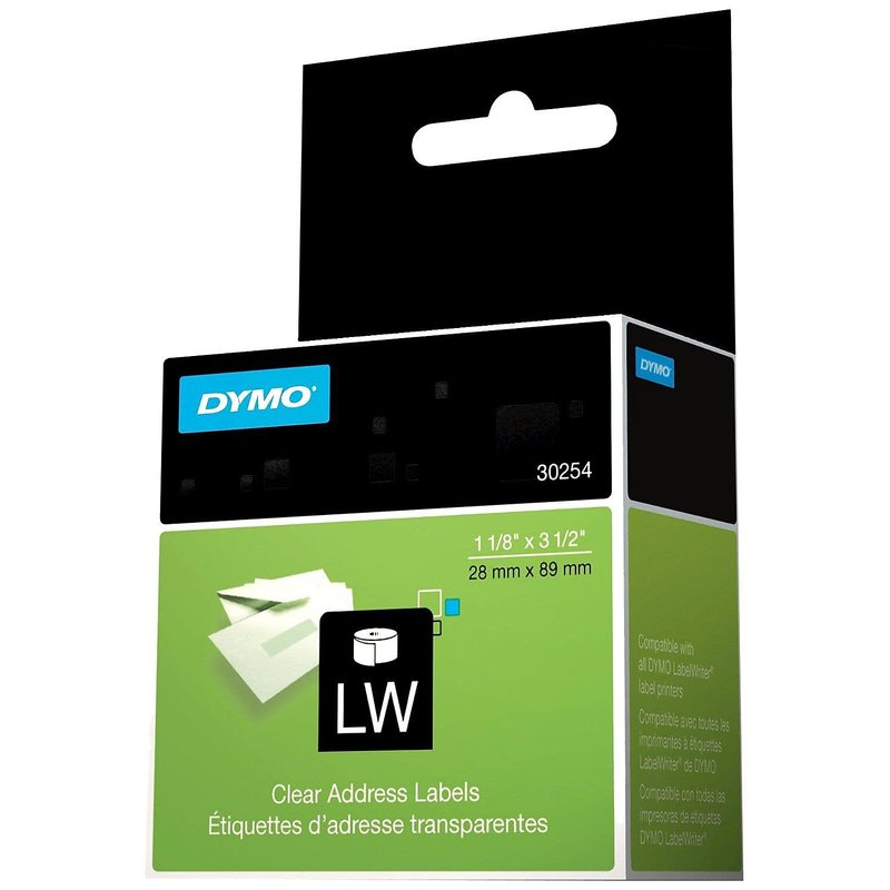 Dymo 30254 LW Address Labels, 1-1/8 x 3-1/2, Clear, 130 Labels/Roll, 1 Roll/BX