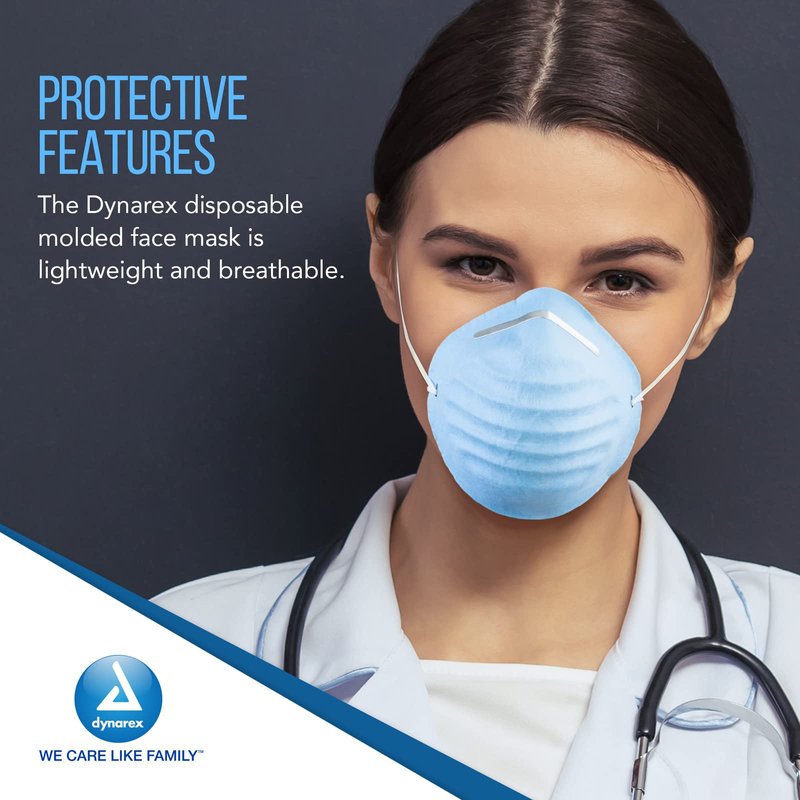 - PROTECTIVE FEATURES: The Dynarex disposable molded face mask is lightweight and breathable. This blue molded face mask is constructed of lightweight material to safeguard your health without compromising comfort.