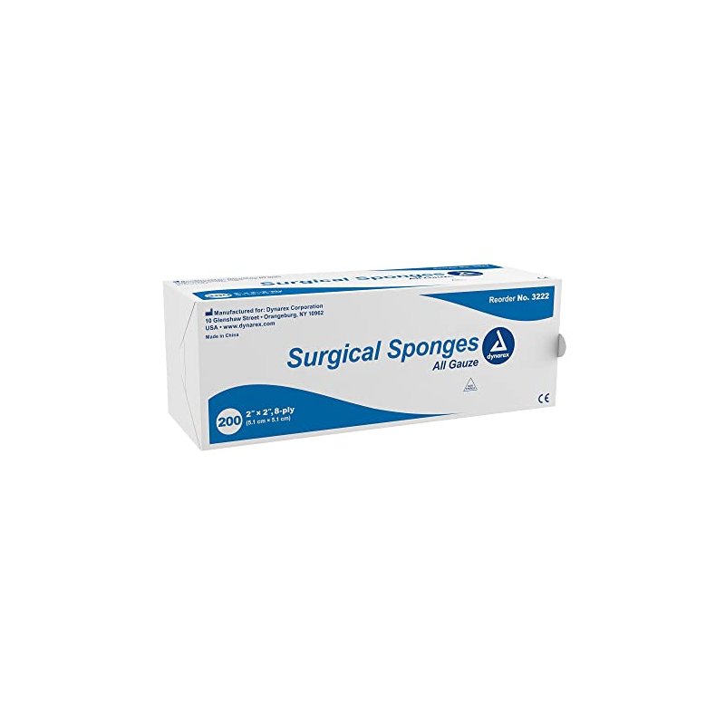 Dynarex Surgical Gauze Sponges- Absorbent Cotton Fabric With Folded Edges - Soft, Durable, Non-Sterile Dressing - 2x2", 8-Ply - Sleeve of 200 Sponges