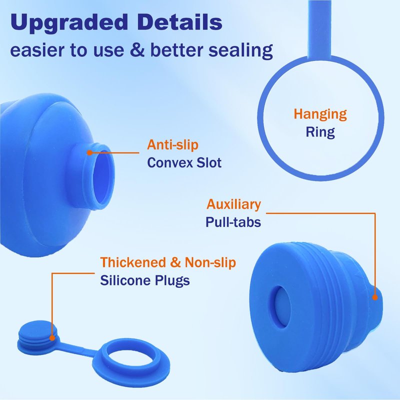 - Anti-drop Thickened Water Jug Cap Plug: Decrease the diameter of its fixing ring thicken the slot on the cap to fit better, and completely solve the problem of falling into the bottle. With food-grade silicone material like the reusable water jug cap and thicker processing to make it more sturdy and durable does not break easily