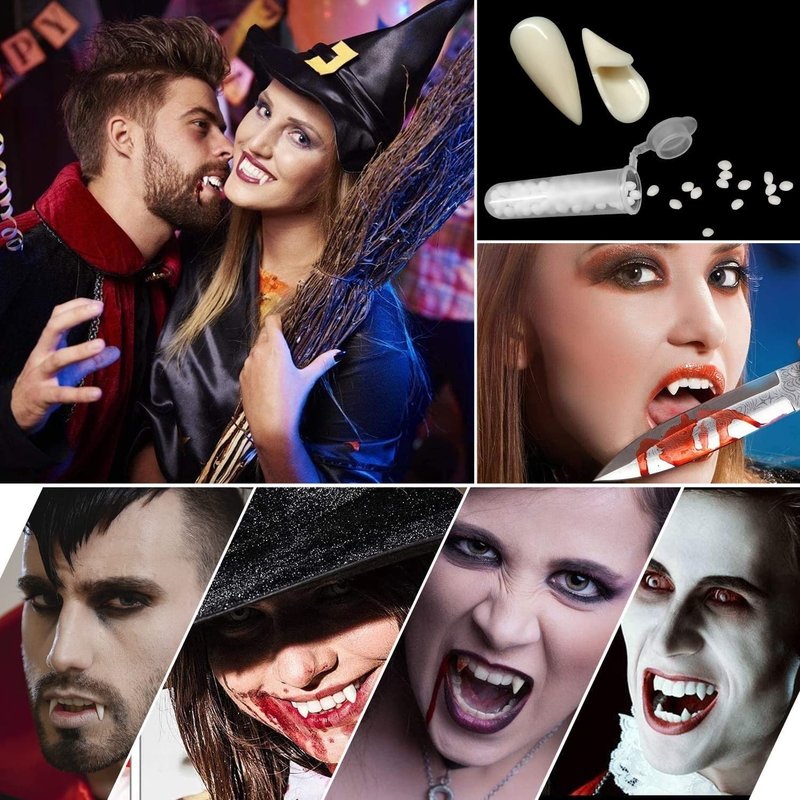 - 【What you get】You will receive 1 pair of vampire fangs(17mm), and each vampire fangs is packed in a small transparent box, there are 1 tubes of 5g adhesive in the vampire fangs set for use. A must have for your Halloween vampire costume!