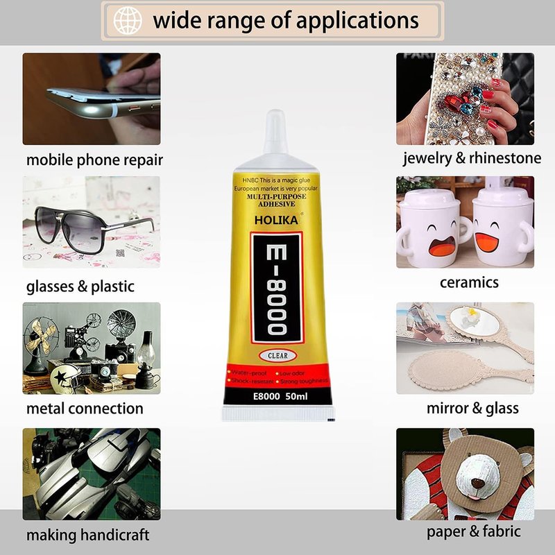- 【Wide Application】E8000 is a new upgrade of b6000 and B7000, with more powerful functions and more environmental protection. This multipurpose craft glue is suitable for most surfaces and is ideal for jewelry, cell phones, glass, metal, plastic, rubber, toys, ceramics, leather, fiber, cloth, wood, nylon, silicone, paper, vinyl and other materials.