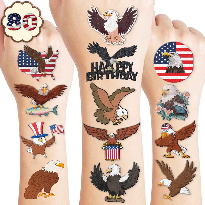 - Including eight sheets tattoos with various styles, sufficient in quantities and colors to meet your daily requirement of using and sharing. You guys can easily use this set of Eagle temporary tattoos with Bald Eagles American Flag theme and take unique photos to make fond memories.