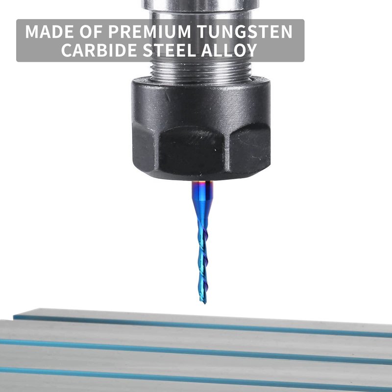 - SOLID CARBIDE AND NANO BLUE COATED: The down-cut spiral router bit is made of solid carbide. And Nano Blue Coating with high hardness and heat resistance enables the tool's cutting edge to retain crucial sharpness and lubricity. This provides longevity and produces cutting results of the highest quality. Clean surface, neat, no glitches.